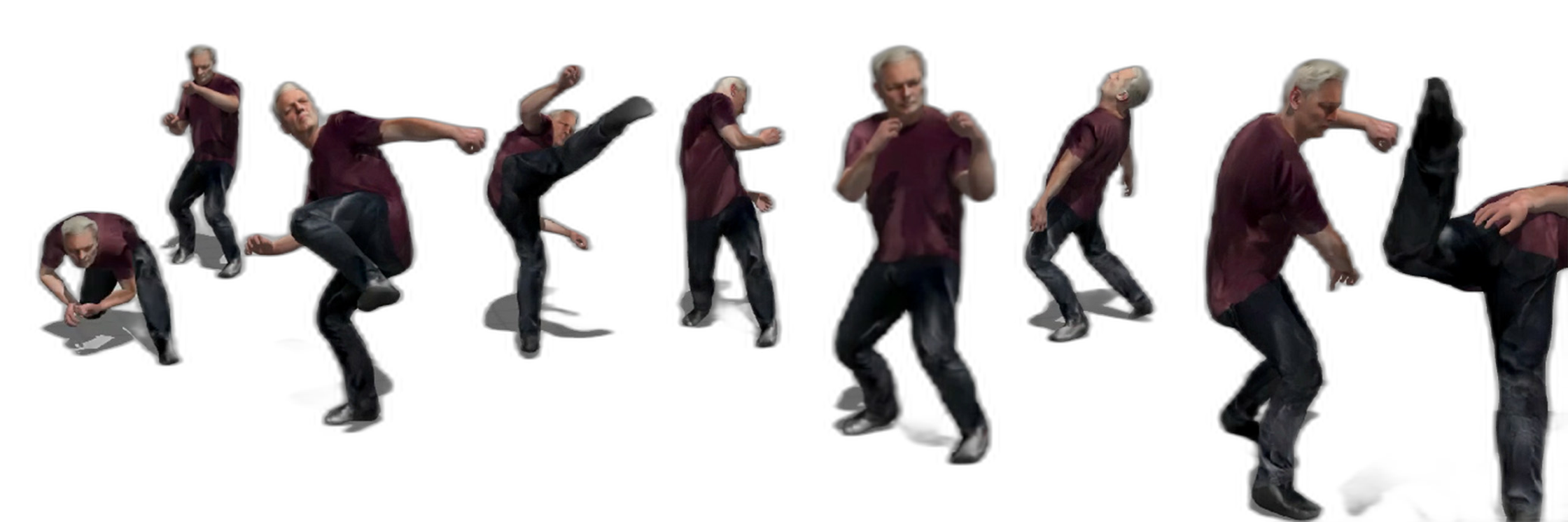 Dieser „Juergen Schubert-Avatar“ verwendet zudem Bewegungsmuster der in der Adobe Mixamo-Bibliothek reichhaltig ausgestatteten Kampfszenen. Die Kampfszenen sind so aufeinander abgestimmt, dass sie den Eindruck vermitteln, also ob die beiden projizierten Figuren permanent miteinander Kämpfen würden. An beiden gegenüberliegende Mauern werden die Szenen also ständig in Beziehung aufeinander nehmen.